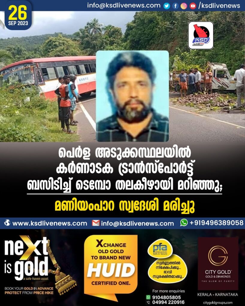 പെർള അടുക്കസ്ഥലയിൽ കര്‍ണാടക ട്രാന്‍സ്‌പോര്‍ട്ട് ബസിടിച്ച് ടെമ്പോ തലകീഴായി മറിഞ്ഞു; മണിയംപാറ സ്വദേശി മരിച്ചു