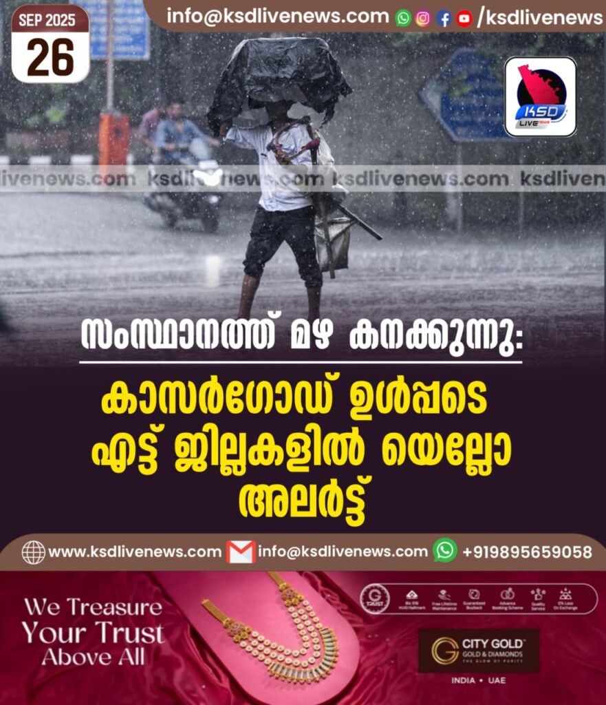 സംസ്ഥാനത്ത് മഴ കനക്കുന്നു; കാസർഗോഡ് ഉൾപ്പടെ എട്ട് ജില്ലകളിൽ യെല്ലോ അലർട്ട്