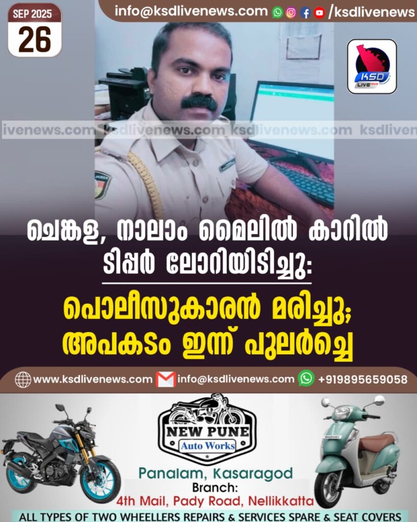 ചെങ്കള, നാലാം മൈലിൽ കാറിൽ ടിപ്പർ ലോറിയിടിച്ചു; പൊലീസുകാരൻ മരിച്ചു, അപകടം ഇന്ന് പുലർച്ചെ