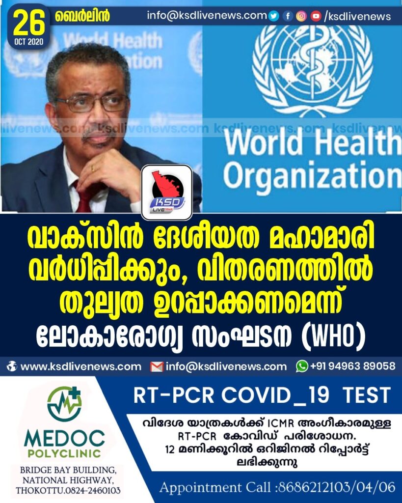 വാക്‌സിന്‍ ദേശീയത മഹാമാരി വര്‍ധിപ്പിക്കും, വിതരണത്തില്‍ തുല്യത ഉറപ്പാക്കണമെന്ന് ലോകാരോഗ്യ സംഘടന (WHO)