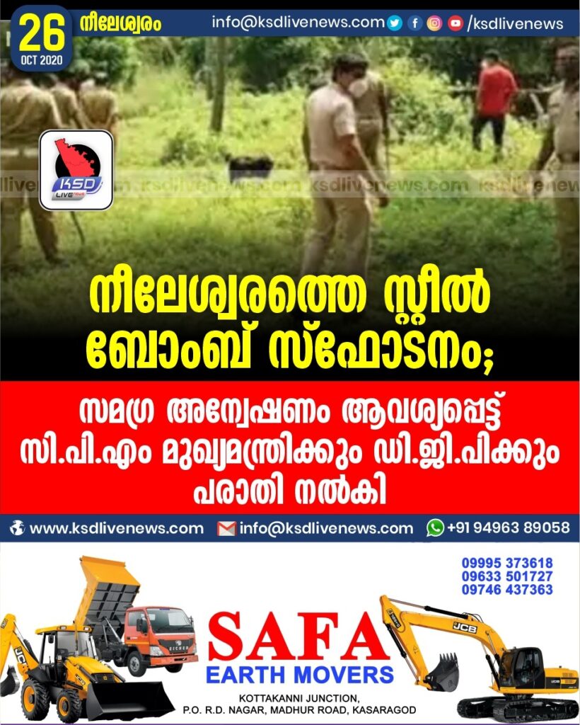 നീലേശ്വരത്തെ സ്റ്റീല്‍ ബോംബ് സ്ഫോടനം ; സമഗ്ര അന്വേഷണം ആവശ്യപ്പെട്ട് സി.പി.എം മുഖ്യമന്ത്രിക്കും ഡി.ജി.പിക്കും പരാതി നല്‍കി