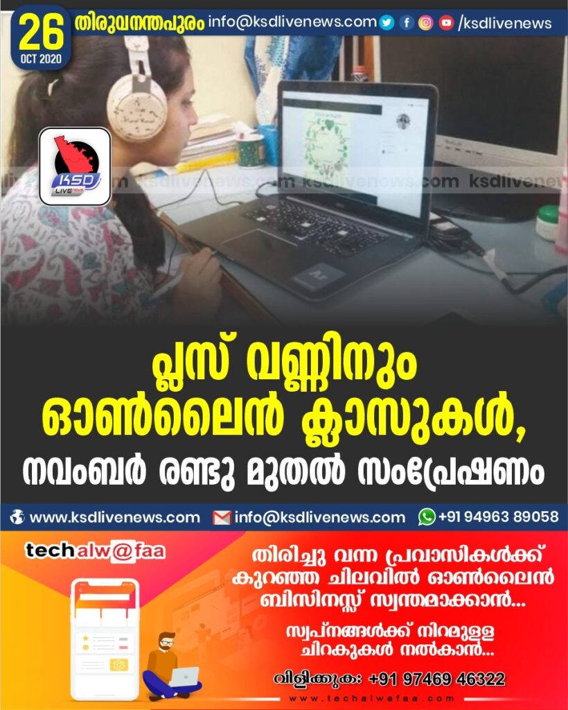 പ്ലസ് വണ്ണിനും ഓൺലൈൻ ക്ലാസുകൾ , നവംബർ രണ്ടു മുതൽ സംപ്രേഷണം