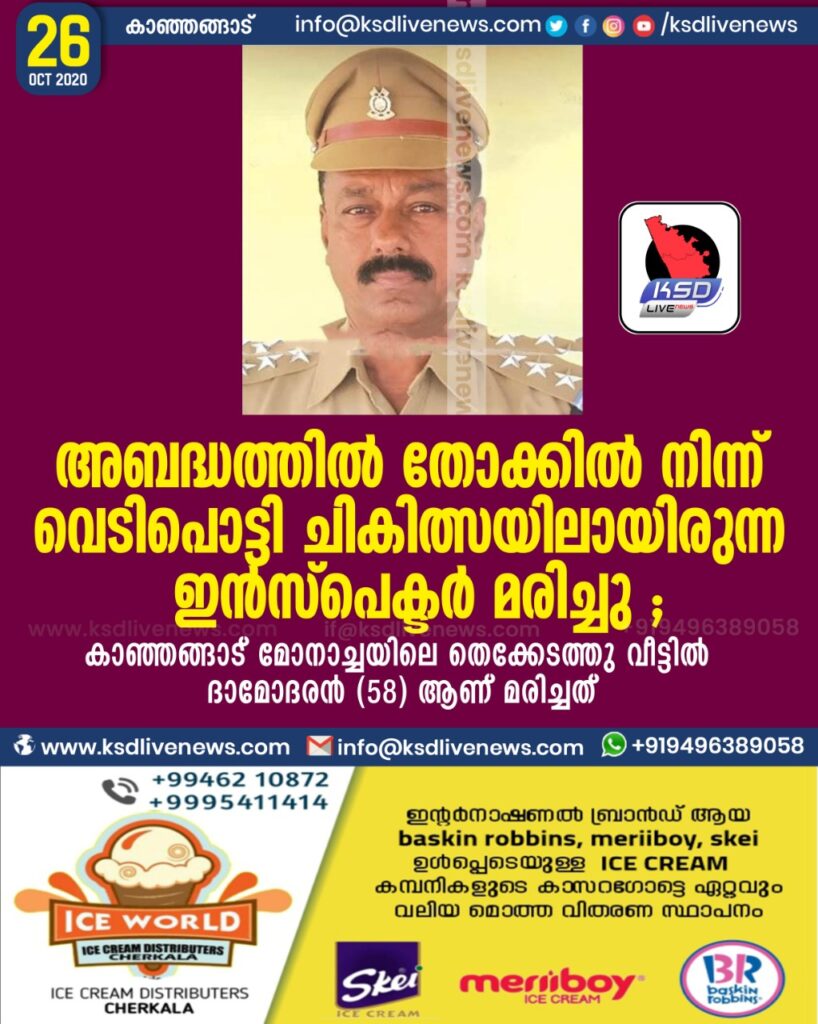 കാഞ്ഞങ്ങാട് സ്വദേശിയായ സി.ആര്.പി.എഫ് ഇന്സ്പെക്ടര് ശ്രീനഗറിൽ സേവനത്തിനിടെ അബദ്ധത്തിൽ തോക്കിൽ നിന്ന് വെടിപൊട്ടി മരണത്തിന് കീഴടങ്ങി