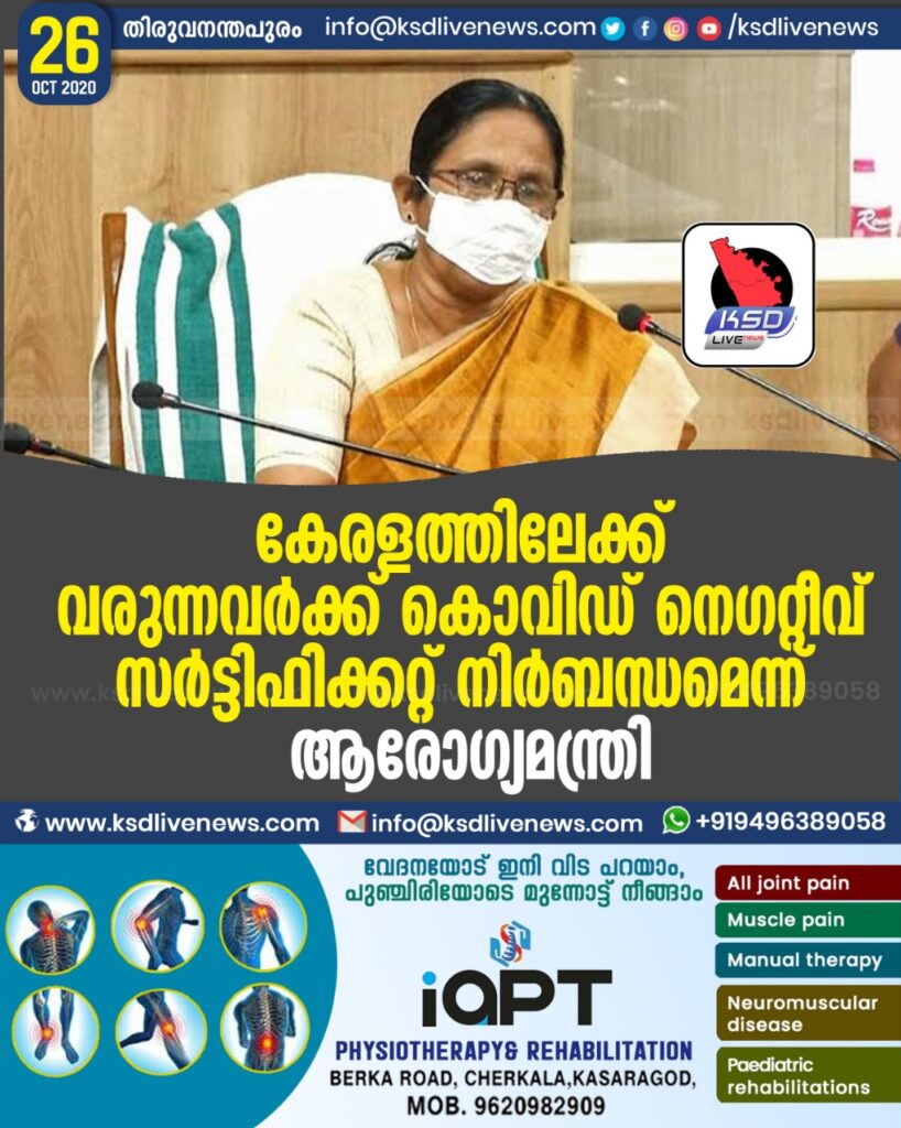 കേരളത്തിലേക്ക് വരുന്നവര്ക്ക് കൊവിഡ് നെഗറ്റീവ് സര്ട്ടിഫിക്കറ്റ് നിര്ബന്ധമെന്ന് ആരോഗ്യമന്ത്രി