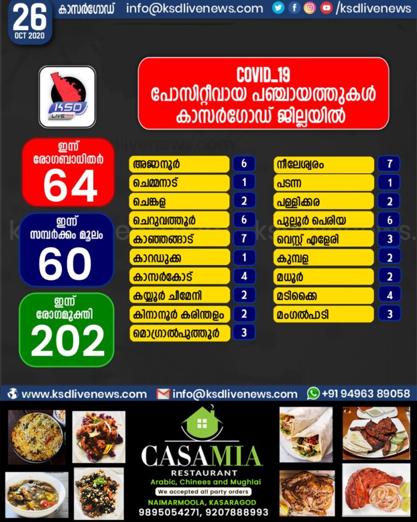 കാസർഗോഡ് ജില്ലയിൽ ഇന്ന് കോവിഡ് പോസിറ്റീവായവരുടെ പഞ്ചായത്ത് തിരിച്ചുള്ള സ്ഥിതി വിവര കണക്ക്