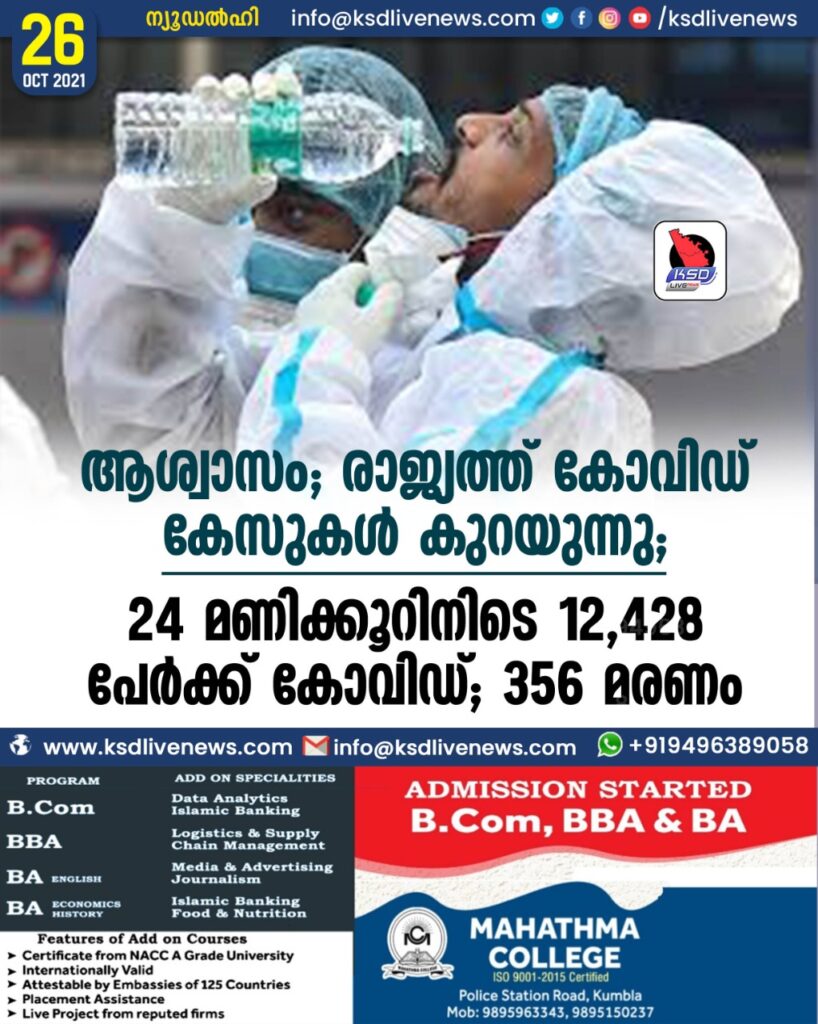 ആശ്വാസം ; രാജ്യത്ത് കോവിഡ് കേസുകൾ കുറയുന്നു; 24 മണിക്കൂറിനിടെ 12,428 പേർക്ക് കോവിഡ്; 356 മരണം