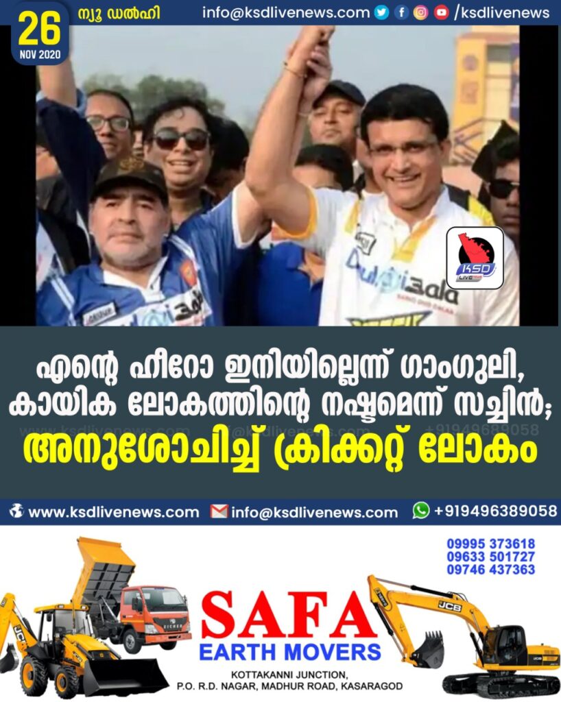 ന്യൂഡൽഹി: ഫുട്ബോൾ ഇതിഹാസം ഡീഗോ മറഡോണയുടെ വേർപാടിൽ അനുശോചനമറിയിച്ച് ക്രിക്കറ്റ് ലോകം. എന്റെ ഹീറോ ഇനിയില്ലെന്ന് മുൻ ഇന്ത്യൻ നായകനും ബി.സി.സി.ഐ പ്രസിഡന്റുമായ സൗരവ് ഗാംഗുലി അനുസ്മരിച്ചു. എന്റെ ഭ്രാന്തൻ പ്രതിഭ സമാധാനത്തോടെ വിശ്രമിക്കുന്നു, നിങ്ങൾ കാരണമാണ് ഞാൻ ഫുട്ബോൾ കണ്ടത് – ഗാംഗുലി ട്വിറ്ററിൽ കുറിച്ചു.