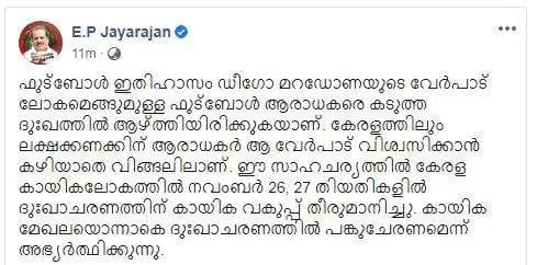 മറഡോണയുടെ വേര്പാട് ലോകമെങ്ങുമുള്ള ഫുട്ബോള് ആരാധകരെ കടുത്ത ദുഃഖത്തില് ആഴ്ത്തിയിരിക്കുകയാണ്. കേരളത്തിലും ലക്ഷക്കണക്കിന് ആരാധകര് ആ വേര്പാട് വിശ്വസിക്കാന് കഴിയാതെ വിങ്ങലിലാണ്. ഈ സാഹചര്യത്തില് കേരളത്തിലെ കായിക മേഖലയൊന്നാകെ ദുഃഖാചരണത്തില് പങ്കുചേരണമെന്ന് അഭ്യര്ത്ഥിക്കുന്നതായി മന്ത്രി ഫെയ്സ്ബുക്ക് കുറിപ്പില് അഭ്യര്ത്ഥിച്ചു.