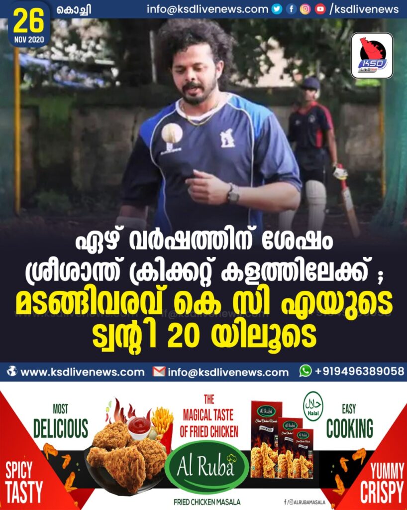 ഏഴ് വർഷത്തിന് ശേഷം ശ്രീശാന്ത് ക്രിക്കറ്റ് കളത്തിലേക്ക് ; മടങ്ങിവരവ് കെ സി എയുടെ ട്വന്റി 20 യിലൂടെ