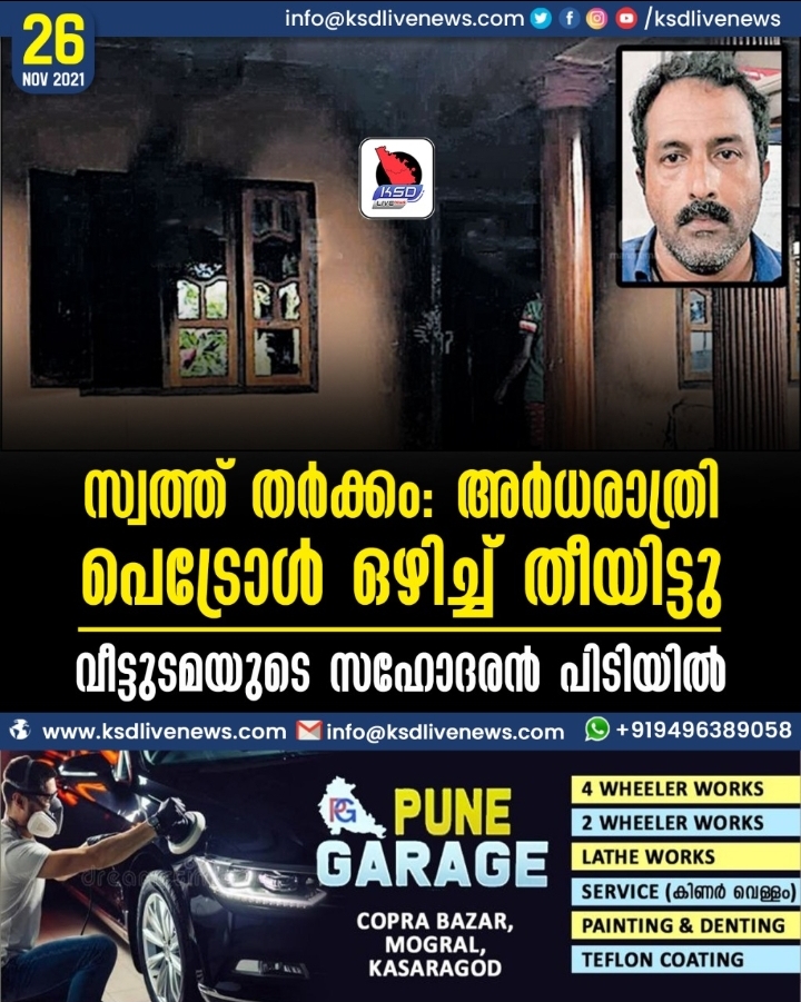 സ്വത്ത് തർക്കം: അർധരാത്രി വീടിന് പെട്രോൾ ഒഴിച്ച് തീയിട്ടു; വീട്ടുടമയുടെ സഹോദരൻ പിടിയിൽ