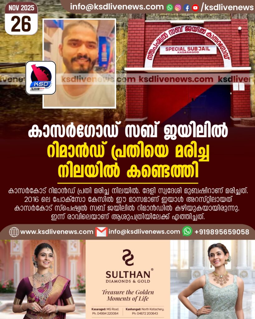 കാസര്‍കോട്: കാസര്‍കോട് റിമാന്‍ഡ് പ്രതി മരിച്ച നിലയില്‍. ദേളി സ്വദേശി മുബഷിറാണ് മരിച്ചത്.2016 ലെ പോക്‌സോ കേസില്‍ ഈ മാസമാണ് ഇയാള്‍ അറസ്റ്റിലായത് കാസര്‍കോട് സ്‌പെഷ്യല്‍ സബ് ജയിലില്‍ റിമാന്‍ഡില്‍ കഴിയുകയായിരുന്നു. ഇന്ന് രാവിലെയാണ് ആശുപത്രിയിലേക്ക് എത്തിച്ചത്.