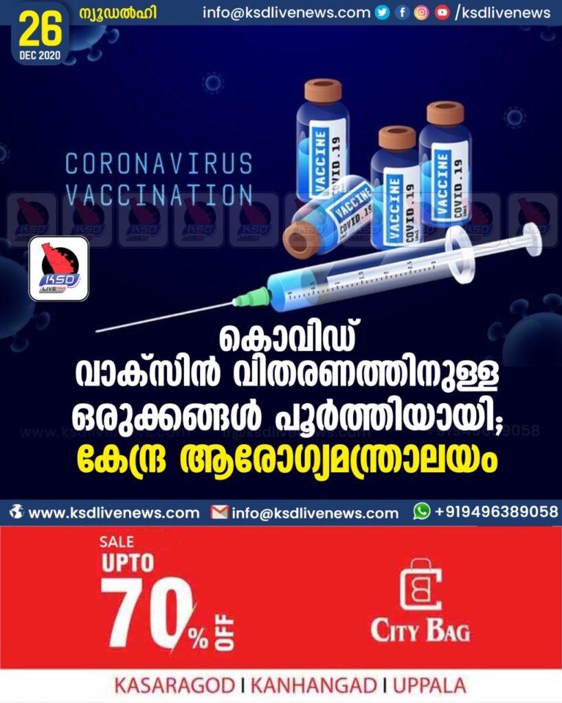 കൊവിഡ് വാക്സിൻ വിതരണത്തിനുള്ള ഒരുക്കങ്ങൾ പൂർത്തിയായി ; കേന്ദ്ര ആരോഗ്യമന്ത്രാലയം