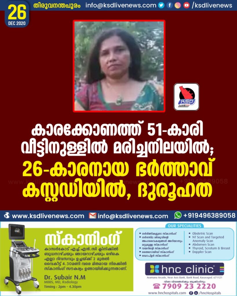 കാരക്കോണത്ത് 51-കാരി വീട്ടിനുള്ളില് മരിച്ചനിലയില്; 26-കാരനായ ഭര്ത്താവ് കസ്റ്റഡിയില്, ദുരൂഹത