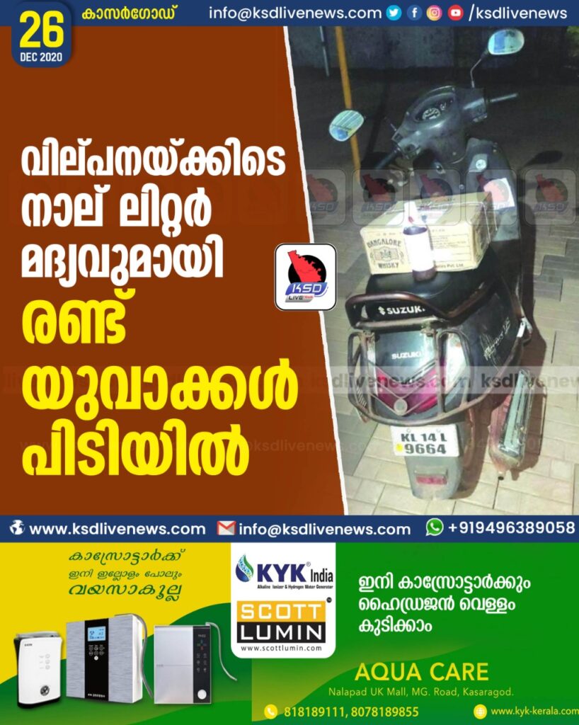 വില്പനയ്ക്കിടെ നാല് ലിറ്റർ മദ്യവുമായി രണ്ട് യുവാക്കൾ പിടിയിൽ