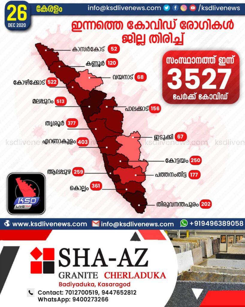 സംസ്ഥാനത്ത് ഇന്ന് 3527 പേര്ക്ക് കോവിഡ്-19 സ്ഥിരീകരിച്ചു. കോഴിക്കോട് 522, മലപ്പുറം 513, എറണാകുളം 403, തൃശൂര് 377, കൊല്ലം 361, ആലപ്പുഴ 259, കോട്ടയം 250, തിരുവനന്തപുരം 202, പത്തനംതിട്ട 177, പാലക്കാട് 156, കണ്ണൂര് 120, വയനാട് 68, ഇടുക്കി 67, കാസര്ഗോഡ് 52 എന്നിങ്ങനേയാണ് ജില്ലകളില് ഇന്ന് രോഗ ബാധ സ്ഥിരീകരിച്ചത്.