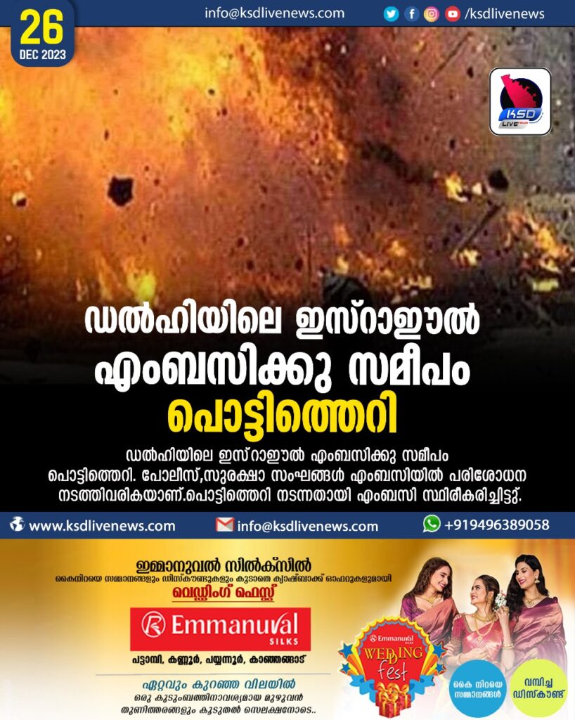 ഇന്ന് വൈകിട്ട് 5.30ഓടെയാണ് സംഭവം. പൊട്ടിത്തെറി നടന്നതായി വൈകിട്ട് ആറോടെ അജ്ഞാതന് ഡല്ഹി ഫയര് സര്വീസിനെ ഫോണില് വിളിച്ചറിയിക്കുകയായിരുന്നു. എംബസിക്ക് പിന്നിലെ ഒഴിഞ്ഞ സ്ഥലത്ത് സ്ഫോടനമുണ്ടായെന്നായിരുന്നു വിളിച്ചയാള് പറഞ്ഞത്.