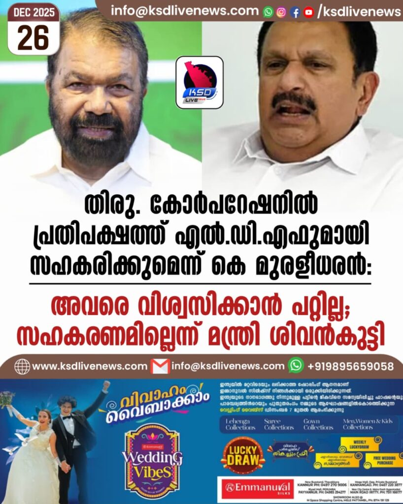 തിരു. കോര്പറേഷനില് പ്രതിപക്ഷത്ത് എല്ഡിഎഫുമായി സഹകരിക്കുമെന്ന് കെ മുരളീധരന്; അവരെ വിശ്വസിക്കാന് പറ്റില്ല, സഹകരണമില്ലെന്ന് മന്ത്രി ശിവന്കുട്ടി