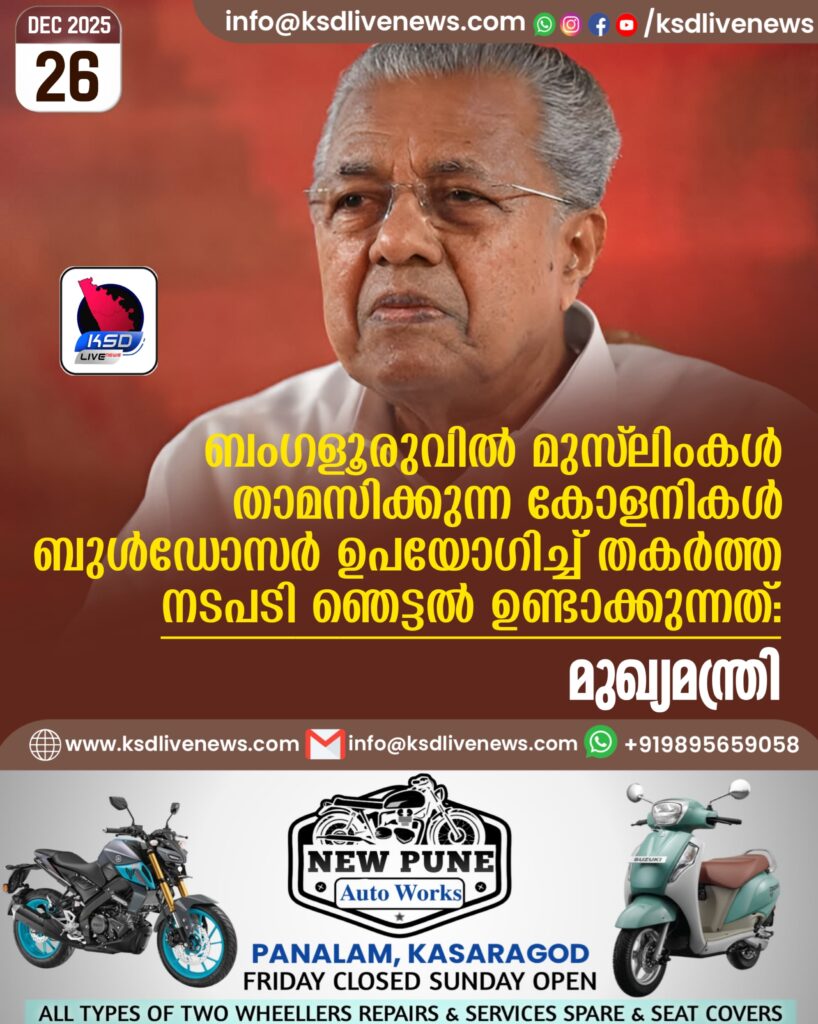 ബംഗളൂരുവിൽ മുസ്ലിംകൾ താമസിക്കുന്ന കോളനികൾ ബുൾഡോസർ ഉപയോഗിച്ച് തകർത്ത നടപടി ഞെട്ടൽ ഉണ്ടാക്കുന്നത്: മുഖ്യമന്ത്രി