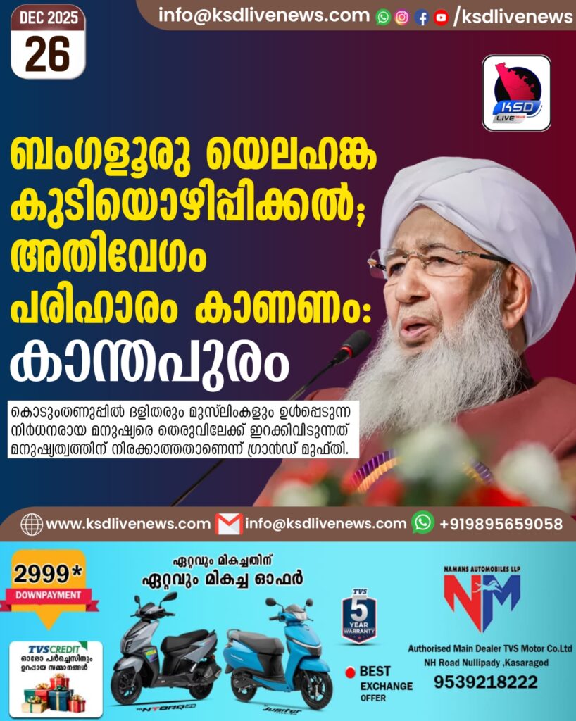 ബംഗളൂരു യെലഹങ്ക കുടിയൊഴിപ്പിക്കൽ; അതിവേഗം പരിഹാരം കാണണം: കാന്തപുരം
