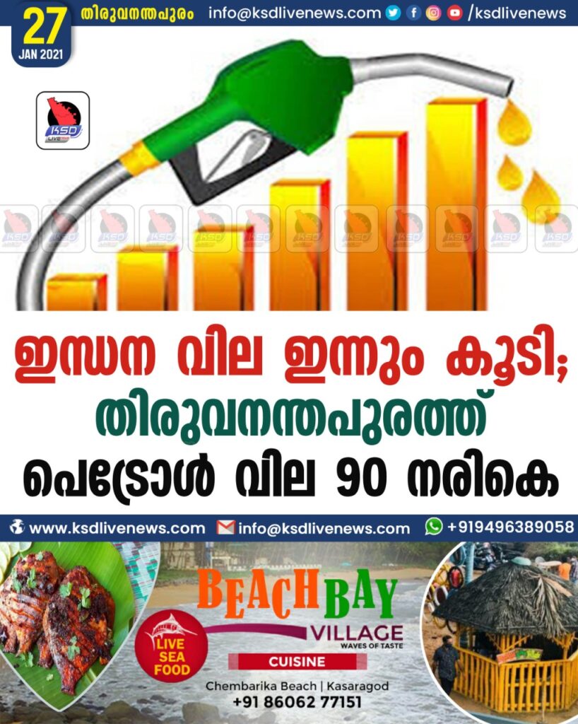 ഇന്ധന വില ഇന്നും കൂടി: തിരുവനന്തപുരത്ത് പെട്രോള്‍ വില 90 നരികെ