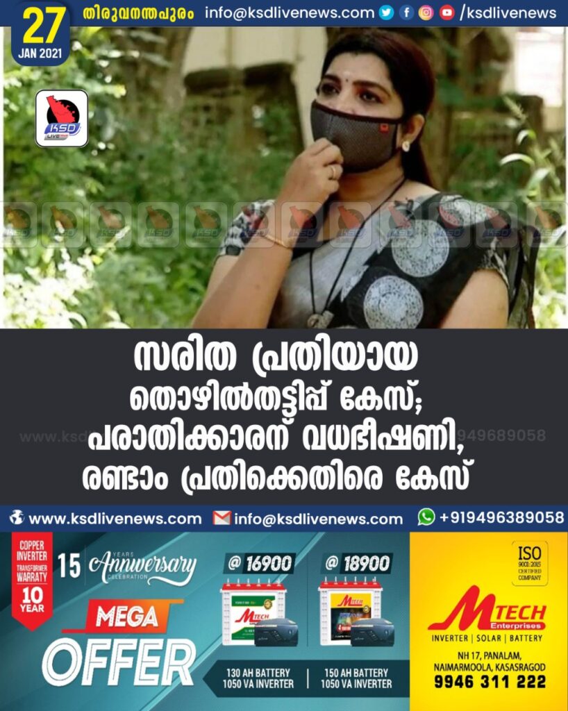 സരിത പ്രതിയായ തൊഴിൽതട്ടിപ്പ് കേസ് ; പരാതിക്കാരന് വധഭീഷണി , രണ്ടാം പ്രതിക്കെതിരെ കേസ്