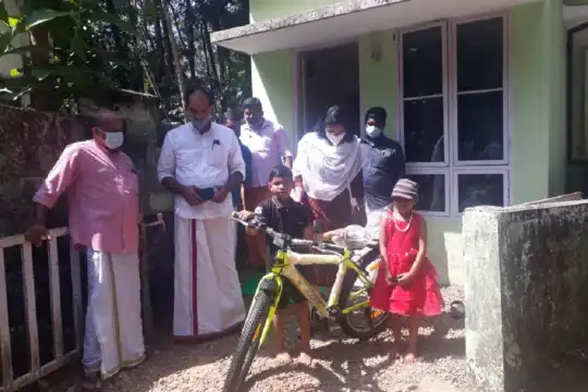 മുഖ്യമന്ത്രിയുടെ പ്രത്യേക നിര്ദ്ദേശപ്രകാരം ജില്ലാ കളക്ടര് എം അഞ്ജന നേരിട്ടെത്തി ജെസ്റ്റിന് സൈക്കിള് നല്കിയപ്പോള്. എലിക്കുളം പഞ്ചായത്ത് പ്രസിഡന്്റ് എസ്.ഷാജി സമീപം.