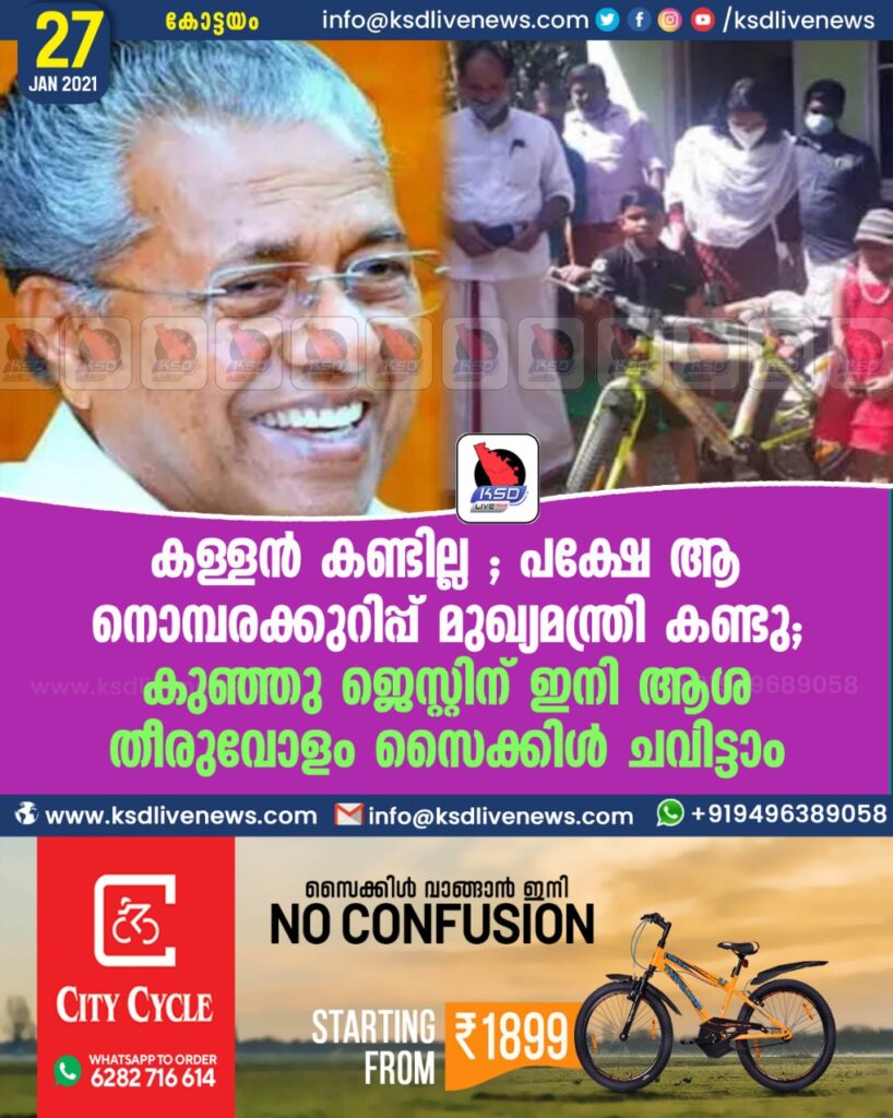 കള്ളൻ കണ്ടില്ല ; പക്ഷേ ആ നൊമ്പരക്കുറിപ്പ് മുഖ്യമന്ത്രി കണ്ടു ; കുഞ്ഞു ജെസ്റ്റിന് ഇനി ആശ തീരുവോളം സൈക്കിൾ ചവിട്ടാം