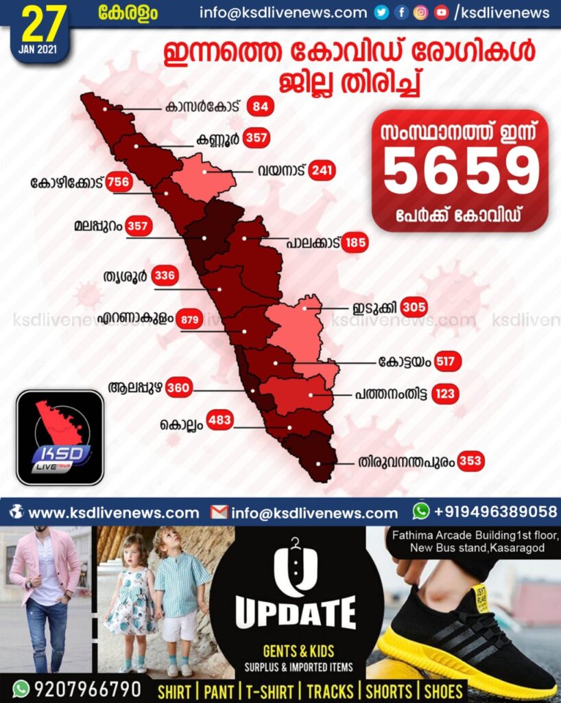 സംസ്ഥാനത്ത് ഇന്ന് 5659 പേര്ക്ക് കോവിഡ്-19 സ്ഥിരീകരിച്ചു. എറണാകുളം 879, കോഴിക്കോട് 758, കോട്ടയം 517, കൊല്ലം 483, മലപ്പുറം 404, പത്തനംതിട്ട 397, ആലപ്പുഴ 360, കണ്ണൂര് 357, തിരുവനന്തപുരം 353, തൃശൂര് 336, ഇടുക്കി 305, വയനാട് 241, പാലക്കാട് 185, കാസര്ഗോഡ് 84 എന്നിങ്ങനേയാണ് ജില്ലകളില് ഇന്ന് രോഗ ബാധ സ്ഥിരീകരിച്ചത്.
