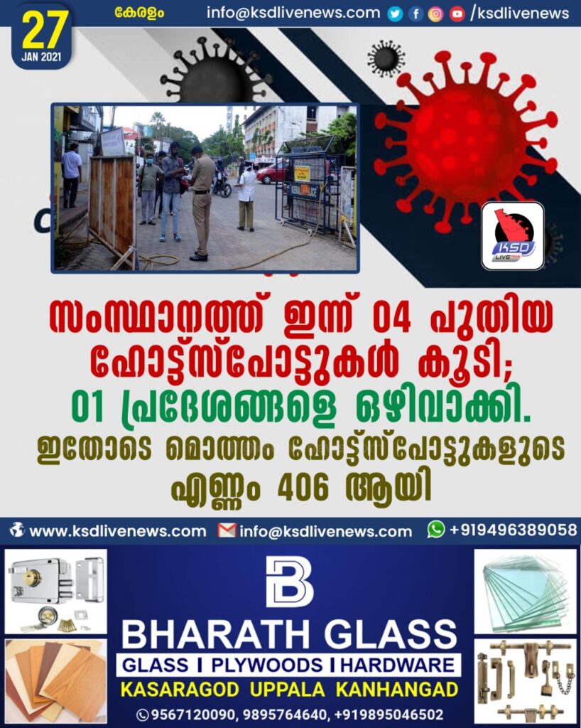 സംസ്ഥാനത്ത് ഇന്ന് 04 പുതിയ ഹോട്ട്സ്പോട്ടുകള് കൂടി; 01 പ്രദേശങ്ങളെ ഒഴിവാക്കി. ഇതോടെ മൊത്തം ഹോട്ട്സ്പോട്ടുകളുടെ എണ്ണം 406 ആയി.