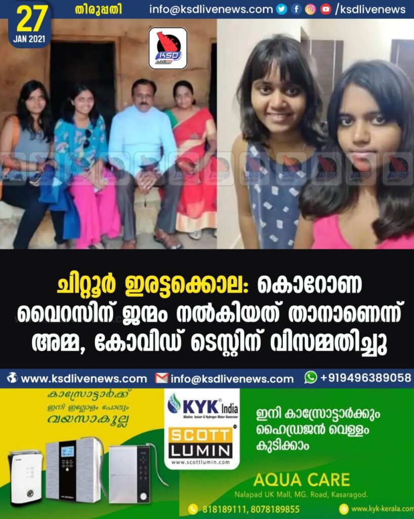 ചിറ്റൂര്‍ ഇരട്ടക്കൊല: കൊറോണ വൈറസിന് ജന്മം നല്‍കിയത് താനാണെന്ന് അമ്മ, കോവിഡ് ടെസ്റ്റിന് വിസമ്മതിച്ചു