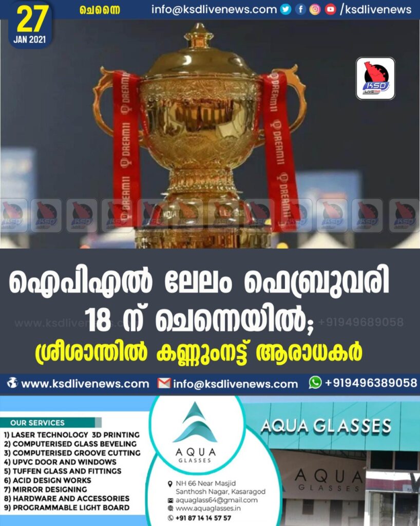 ഐപിഎൽ ലേലം ഫെബ്രുവരി 18 ന് ചെന്നെയിൽ ശ്രീശാന്തിൽ കണ്ണും നട്ട് ആരാധകർ