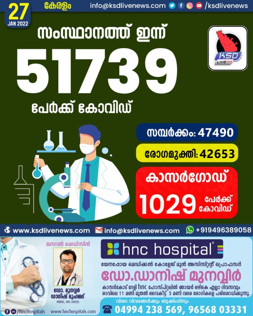 സംസ്ഥാനത്ത് ഇന്ന് 51739 കോവിഡ് സ്ഥിരീകരിച്ചു. സമ്പർക്കം വഴി 47490 പേർക്കും ; ആശ്വാസമായി 42653 പേർക്ക് രോഗമുക്തി ; കാസർഗോഡ് ജില്ലയിൽ 1029 പേർക്ക് പുതിയ കോവിഡ് കേസുകൾ ; മരണം 11