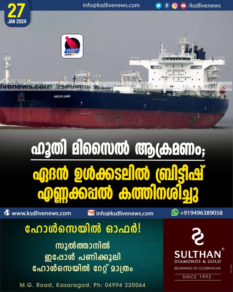 ഹൂതി മിസൈൽ ആക്രമണം; ഏദൻ ഉൾക്കടലിൽ ബ്രിട്ടീഷ് എണ്ണക്കപ്പൽ കത്തിനശിച്ചു