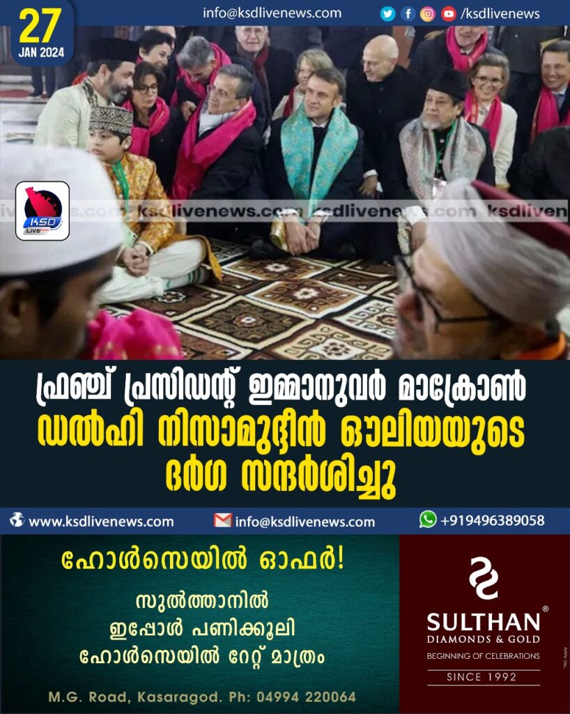 ഡല്ഹിയിലെ റോഡ് ഓഫ് ഡ്യൂട്ടിയില് നടന്ന 75-ാമത് റിപ്പബ്ലിക് ദിനാഘോഷത്തില് മുഖ്യാതിഥിയായിരുന്നു ഇമ്മാനുവല് മാക്രോണ്. വെള്ളിയാഴ്ച രാത്രി പത്തരയോടെയാണ് രാജ്യത്തെ 700 വർഷം പഴക്കമുള്ള ദർഗയില് അദ്ദേഹം സന്ദർശനത്തിന് എത്തിയത്. അരമണിക്കൂറിലധികം അദ്ദേഹം അവിടെ തങ്ങി.