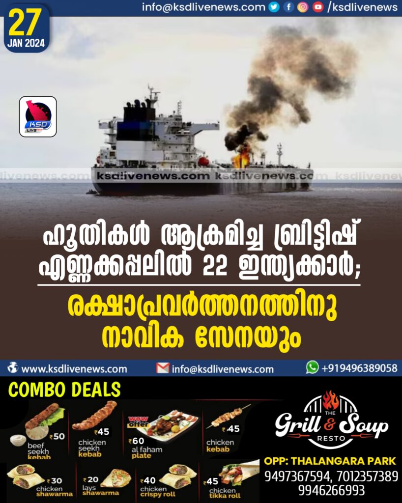 ഹൂതികൾ ആക്രമിച്ച ബ്രിട്ടിഷ് എണ്ണക്കപ്പലിൽ 22 ഇന്ത്യക്കാർ; രക്ഷാപ്രവർത്തനത്തിനു നാവിക സേനയും