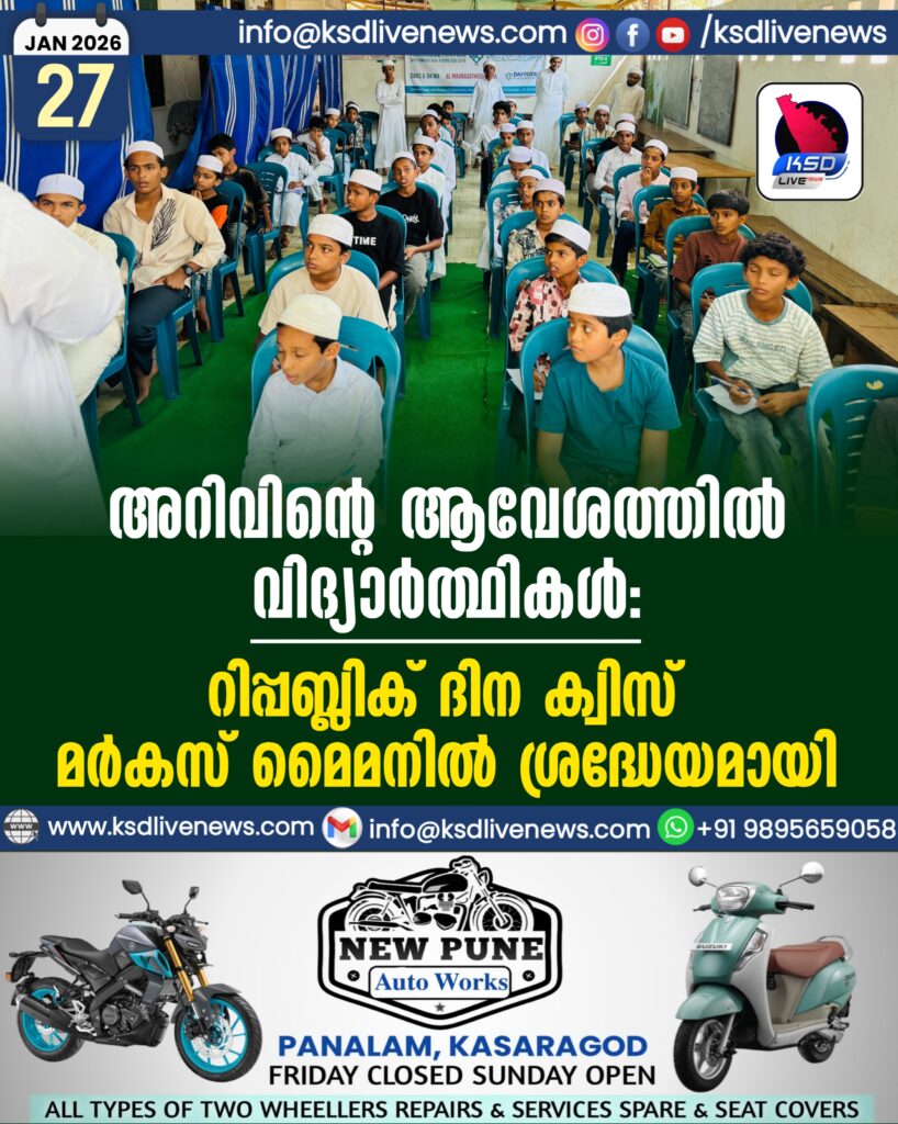 മൊഗ്രാൽപുത്തൂർ: റിപ്പബ്ലിക് ദിനാഘോഷങ്ങളുടെ ഭാഗമായി കോട്ടക്കുന്ന് മർകസ് മൈമനിൽ സംഘടിപ്പിച്ച റിപ്പബ്ലിക് ദിന ക്വിസ്,ഡിസ്കഷൻ പരിപാടി വിദ്യാർത്ഥികളുടെ സജീവ പങ്കാളിത്തവും ആവേശവും കൊണ്ട് ശ്രദ്ധേയമായി. അറിവും ചിന്തയും സംവാദവും സമന്വയിച്ച പരിപാടി വിദ്യാർത്ഥികൾക്ക് പുതിയ അനുഭവമായി. പരിപാടിയിൽ സഈദ് സഅദി കോട്ടക്കുന്ന്, അബ്ദുൽ സലാം സഅദി, ആസിഫ് ഹിമമി സഖാഫി,വാർഡ് മെമ്പർ അമീർ മഠത്തിൽ എന്നിവർ മുഖ്യ അതിഥികളായി പങ്കെടുത്തു. റിപ്പബ്ലിക് ദിനത്തിന്റെ പ്രാധാന്യവും ഭരണഘടനയുടെ മൂല്യങ്ങളും യുവതലമുറ ഉൾക്കൊള്ളേണ്ടതിന്റെ ആവശ്യകതയും അതിഥികൾ പ്രസംഗങ്ങളിൽ വിശദീകരിച്ചു.