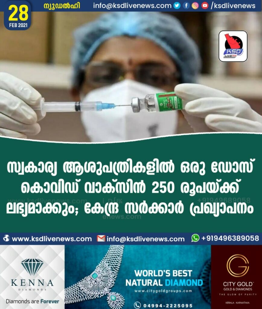 സ്വകാര്യ ആശുപത്രികളിൽ ഒരു ഡോസ് കൊവിഡ് വാക്സിൻ 250 രൂപയ്ക്ക് ലഭ്യമാക്കും ; കേന്ദ്ര സർക്കാർ പ്രഖ്യാപനം
