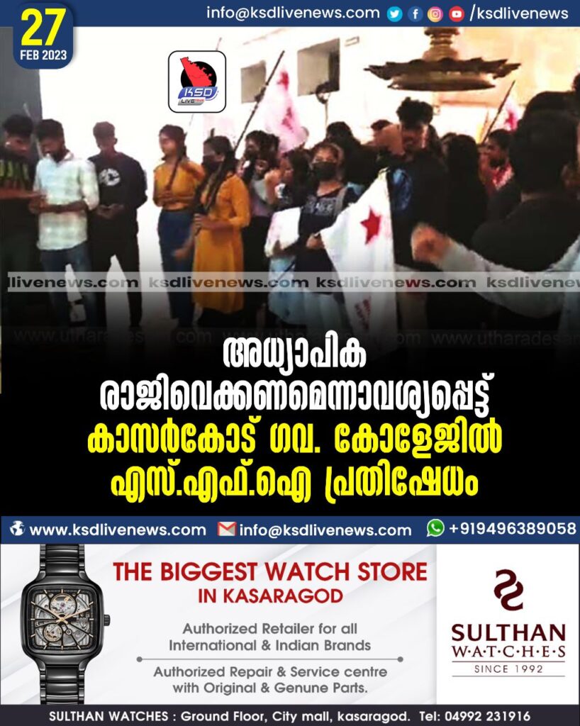 അധ്യാപിക രാജിവെക്കണമെന്നാവശ്യപ്പെട്ട് കാസര്കോട് ഗവ. കോളേജില് എസ്.എഫ്.ഐ പ്രതിഷേധം