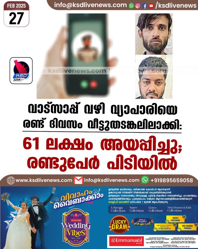വാട്സാപ്പ് വഴി വ്യാപാരിയെ രണ്ട് ദിവസം വീട്ടുതടങ്കലിലാക്കി, 61 ലക്ഷം അയപ്പിച്ചു; രണ്ടുപേർ പിടിയിൽ