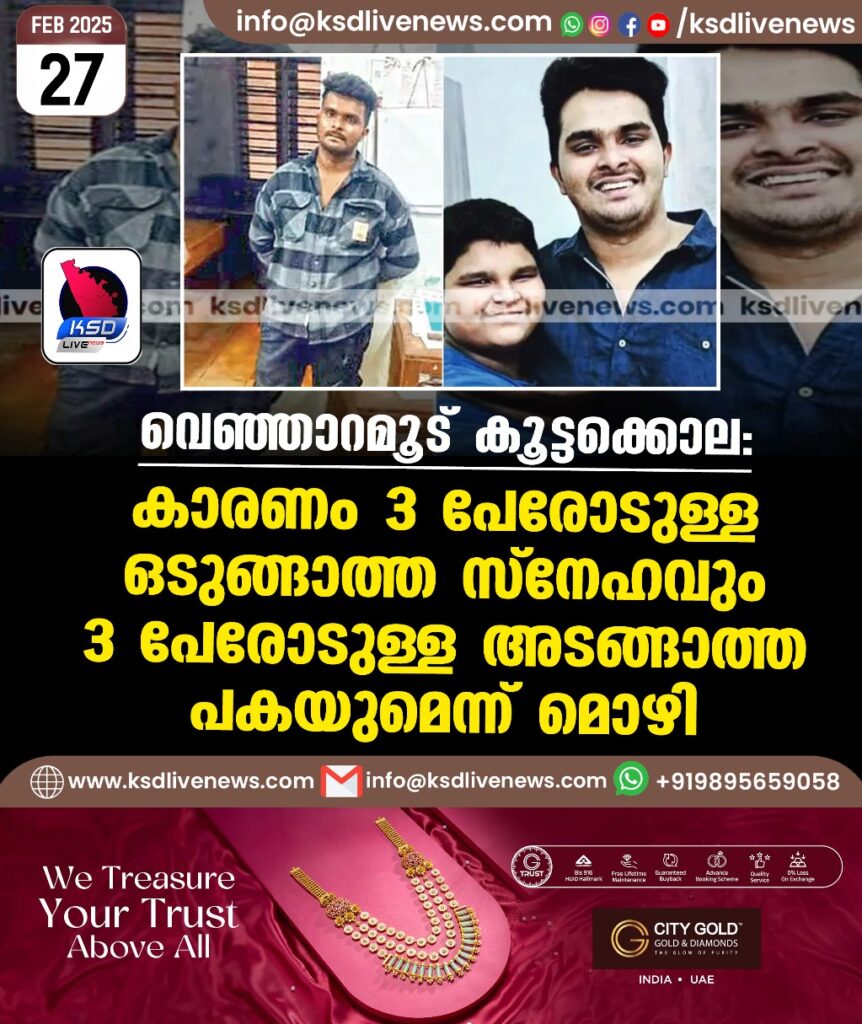 വെഞ്ഞാറമൂട് കൂട്ടക്കൊല: കാരണം 3 പേരോടുള്ള ഒടുങ്ങാത്ത സ്നേഹവും 3 പേരോടുള്ള അടങ്ങാത്ത പകയുമെന്ന് മൊഴി