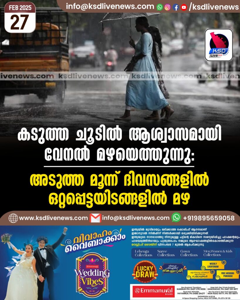 കടുത്ത ചൂടിൽ ആശ്വാസമായി വേനൽ മഴയെത്തുന്നു: അടുത്ത മൂന്ന് ദിവസങ്ങളിൽ ഒറ്റപ്പെട്ടയിടങ്ങളിൽ മഴ