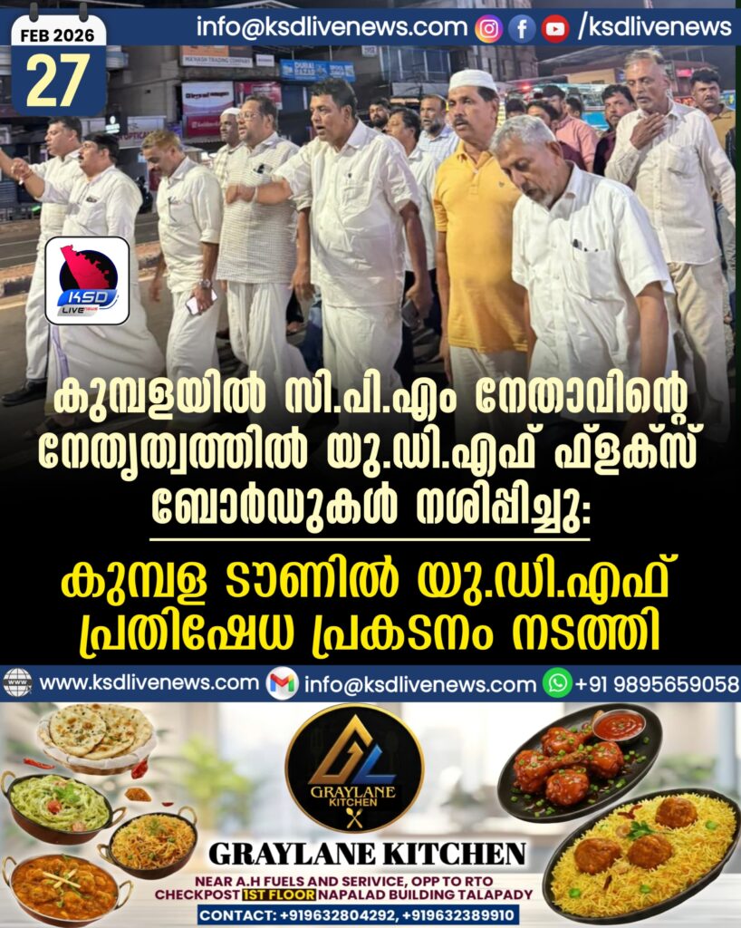കുമ്പളയിൽ സി.പി.എം നേതാവിൻ്റെ നേതൃത്വത്തിൽ യു.ഡി.എഫ് ഫ്ളക്സ് ബോർഡുകൾ നശിപ്പിച്ചു; കുമ്പള ടൗണിൽ യു.ഡി.എഫ് പ്രതിഷേധ പ്രകടനം നടത്തി