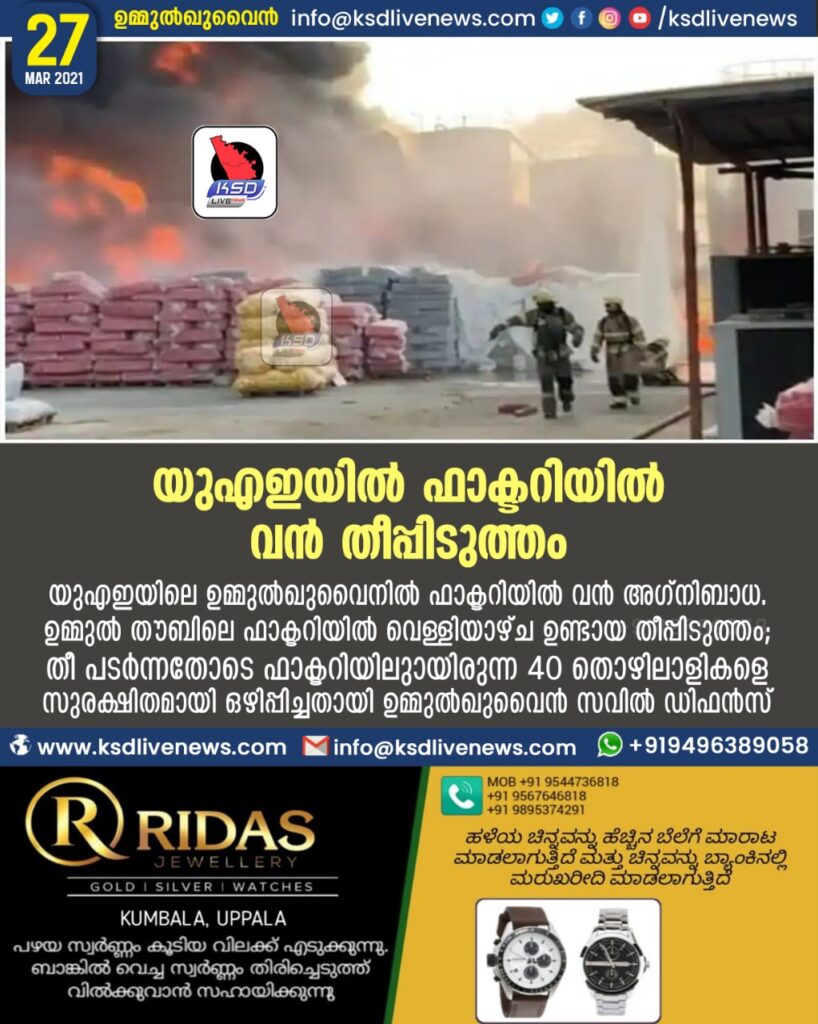 ഉമ്മുല്ഖുവൈന്: യുഎഇയിലെ ഉമ്മുല്ഖുവൈനില് ഫാക്ടറിയില് വന് അഗ്നിബാധ. ഉമ്മുല് തൗബിലെ ഫാക്ടറിയില് വെള്ളിയാഴ്ച ഉണ്ടായ തീപ്പിടുത്തം അഗ്നിശമനസേന അംഗങ്ങളെത്തി നിയന്ത്രണ വിധേയമാക്കി.