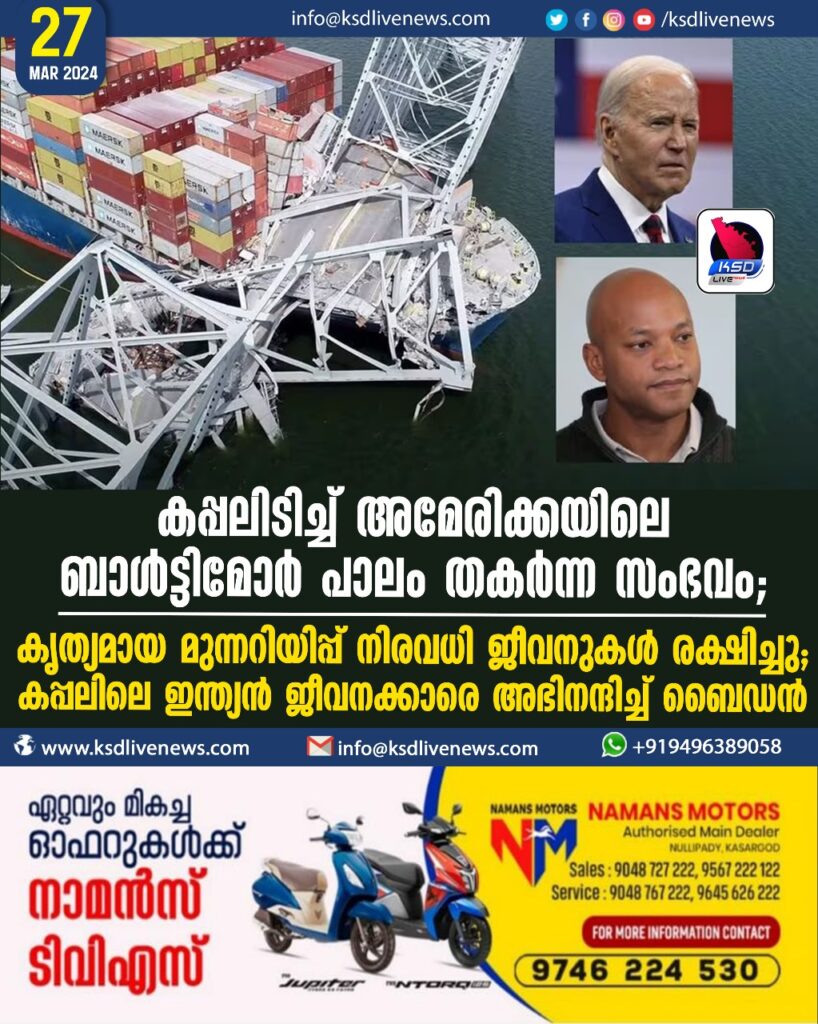 കപ്പലിടിച്ച് അമേരിക്കയിലെ ബാൾട്ടിമോർ പാലം തകർന്ന സംഭവം ; കൃത്യമായ മുന്നറിയിപ്പ് നിരവധി ജീവനുകള് രക്ഷിച്ചു; കപ്പലിലെ ഇന്ത്യന് ജീവനക്കാരെ അഭിനന്ദിച്ച് ബൈഡന്