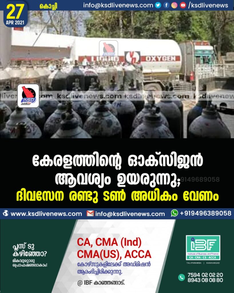 കേരളത്തിന്റെ ഓക്‌സിജൻ ആവശ്യം ഉയരുന്നു; ദിവസേന രണ്ടു ടൺ അധികം വേണം