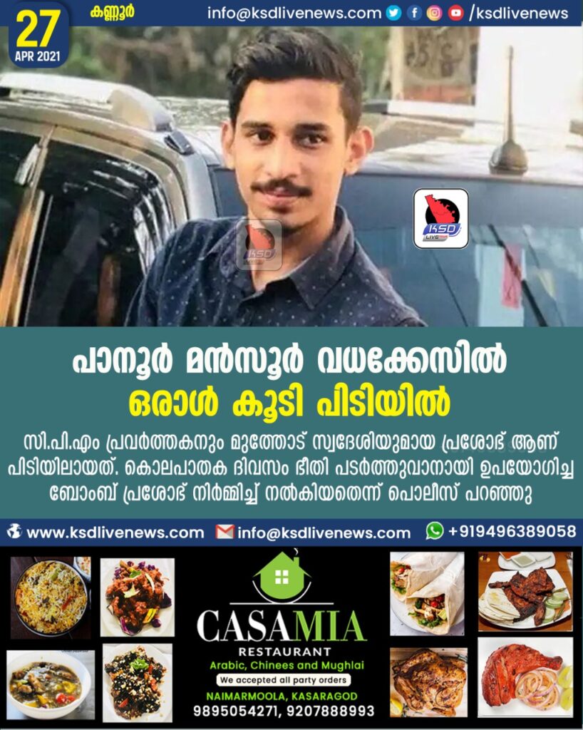കണ്ണൂർ: പാനൂർ മൻസൂർ വധക്കേസിൽ ഒരാൾ കൂടി പിടിയിൽ. സി.പി.എം പ്രവർത്തകനും മുണ്ടത്തോട് സ്വദേശിയുമായ പ്രശോഭ് ആണ് പിടിയിലായത്. കൊലപാതക ദിവസം ഭീതി പടർത്തുവാനായി ഉപയോഗിച്ച ബോംബ് പ്രശോഭ് നിർമ്മിച്ച് നൽകിയതെന്ന് പൊലീസ് പറഞ്ഞു. പ്രശോഭിന്‍റെ വീട്ടിൽ നിന്ന് ആയുധങ്ങളും കണ്ടെടുത്തിട്ടുണ്ട്. പെരിങ്ങത്തൂർ പുല്ലൂക്കര മുക്കിൽ പീടികയിൽ നിയമസഭ തെരഞ്ഞെടുപ്പിന്‍റെ വോട്ടെടുപ്പിന് പിന്നാലെയുണ്ടായ ആക്രമണത്തിലാണ് യൂത്ത് ലീഗ് പ്രവർത്തകനായ പാറാൽ മൻസൂർ (22) കൊല്ലപ്പെട്ടത്. രാത്രി എട്ടു മണിയോടെ വീട്ടിൽ കയറി ബോംബെറിഞ്ഞ ശേഷമാണ് അക്രമിസംഘം മൻസൂറിനെ വെട്ടിക്കൊലപ്പെടുത്തിയത്. വീട്ടുമുറ്റത്ത് കൂട്ടുകാരോടൊത്ത് സംസാരിച്ച് കൊണ്ടിരിക്കെയാണ് ബോംബെറിഞ്ഞ് ഭീകരാന്തരീക്ഷം സൃഷ്ടിച്ച അക്രമി സംഘം മൻസൂറിനെ വലിച്ചിഴച്ച് വെട്ടുകയായിരുന്നു. മൻസൂറിന്‍റെ മാതാവിനും സഹോദരൻ മുഹ്സിനും (27) അയൽപക്കത്തുള്ള സ്ത്രീക്കും ആക്രമണത്തിൽ പരിക്കേറ്റിരുന്നു. കേസിൽ പ്രതിയും സി.പി.എം പ്രവർത്തകനുമായ ഷിനോസിനെ മൻസൂറിന്‍റെ സഹോദരൻ മുഹ്സിൻ പിടികൂടി പൊലീസിന് കൈമാറിയിരുന്നു. കേസിലെ രണ്ടാം പ്രതിയും പുല്ലൂക്കര സ്വദേശിയുമായ രതീഷ് കൂലോത്തിനെ തൂങ്ങിമരിച്ച നിലയിൽ കണ്ടെത്തിയിരുന്നു.