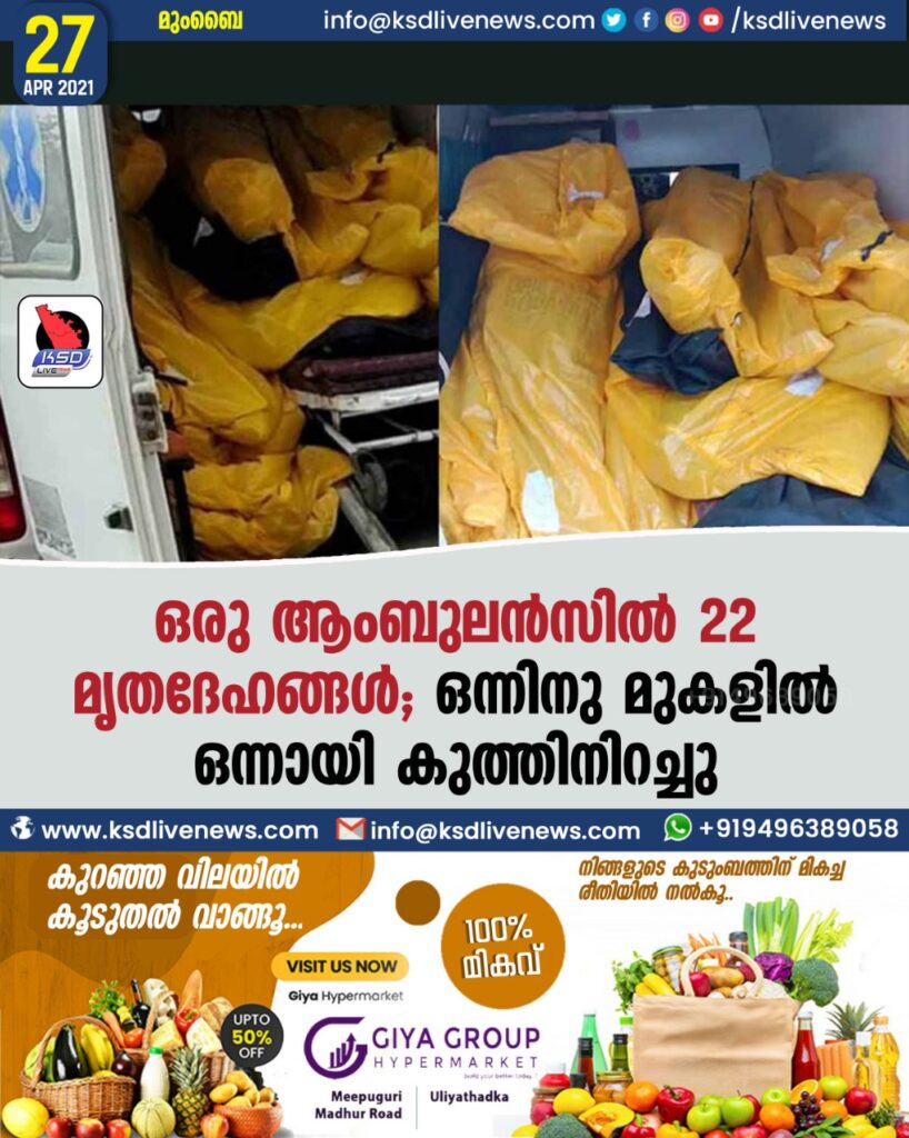 മുംബൈ ∙ കോവിഡിന്റെ ഭീകരത എന്തെന്നു മനസ്സിലാക്കി തരുന്ന ചിത്രമാണു മഹാരാഷ്ട്രയിൽനിന്നു പുറത്തുവരുന്നത്. രോഗികളുടെ എണ്ണത്തിനൊപ്പം മരണവും കൂടിയതോടെ മൃതദേഹങ്ങൾക്കു ആദരവ് നൽകാൻ ആരോഗ്യപ്രവർത്തകർ ആഗ്രഹിച്ചാൽ പോലും കഴിയാത്ത സ്ഥിതി. സർക്കാർ ആശുപത്രിയിൽ മരിച്ച 22 പേരുടെ മൃതദേഹങ്ങൾ ഓരോ പ്ലാസ്റ്റിക് ബാഗുകളിലാക്കി ഒരു ആംബുലൻസിൽ കുത്തിനിറച്ചു കൊണ്ടുപോകുന്ന കാഴ്ച ആരെയും നടുക്കുന്നതാണ്.