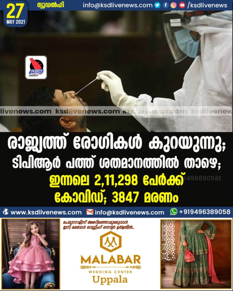 ന്യൂഡല്‍ഹി: രാജ്യത്ത് കോവിഡ് രോഗികളുടെ എണ്ണം കുറയുന്നു. കഴിഞ്ഞ ഇരുപത്തിനാലു മണിക്കൂറിനിടെ കോവിഡ് സ്ഥിരീകരിച്ചത് 2,11,298 പേര്‍ക്ക്. 2,83,135 പേര്‍ ഈ സമയത്തിനിടെ രോഗമുക്തി നേടി. 3847 പേരാണ് മരിച്ചത്. കഴിഞ്ഞ ഇരുപത്തിനാലു മണിക്കൂറിനിടെ കോവിഡ് സ്ഥിരീകരിച്ചത് 2,08,921 പേര്‍ക്ക്. 2,95,955 പേര്‍ ഈ സമയത്തിനിടെ രോഗമുക്തി നേടി.