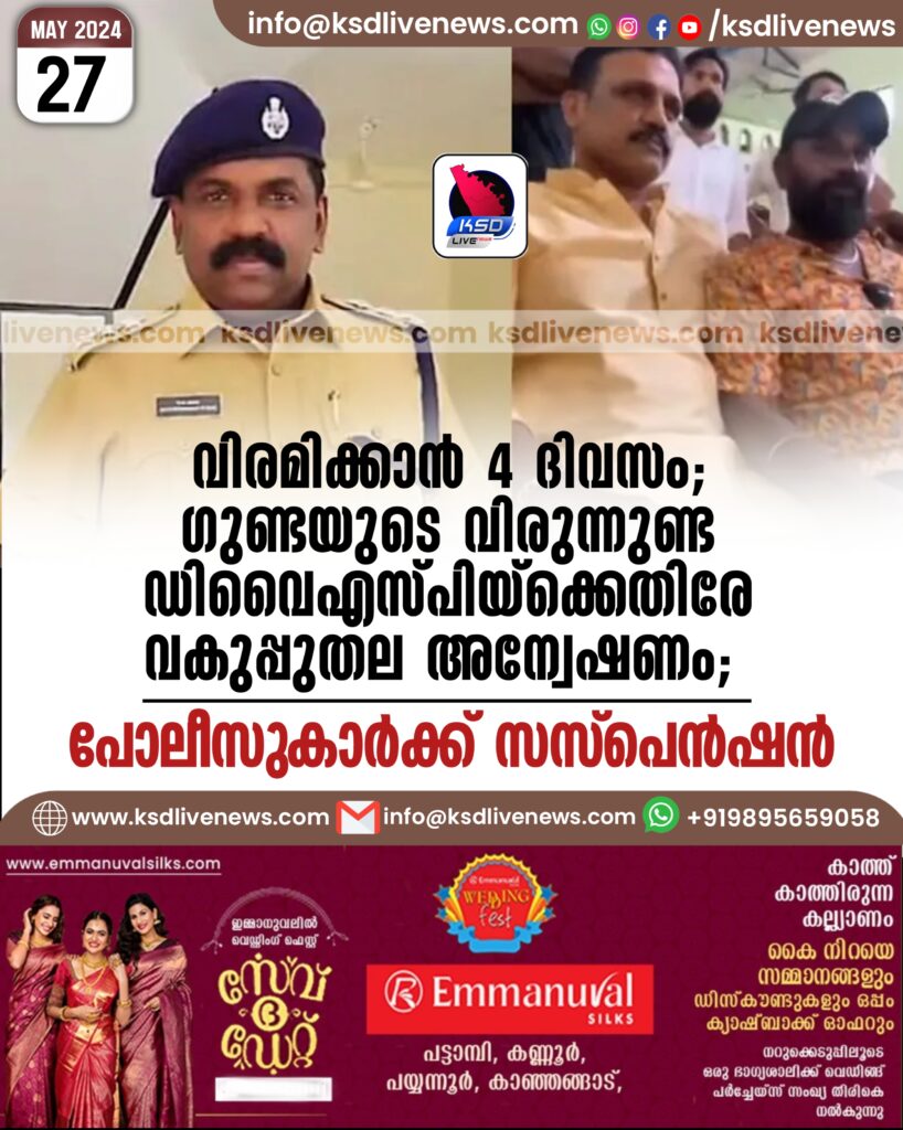 വിരമിക്കാൻ 4 ദിവസം; ഗുണ്ടയുടെ വിരുന്നുണ്ട ഡിവൈഎസ്പിയ്ക്കെതിരേ വകുപ്പുതല അന്വേഷണം, പോലീസുകാർക്ക് സസ്പെൻഷൻ