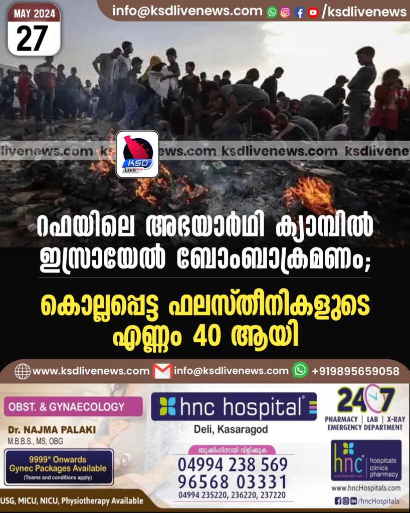 ഗാസസിറ്റി: റഫയിലെ അഭയാർഥി ക്യാമ്ബില് ഇസ്രായേലിന്റെ ബോംബാക്രമണത്തില് കൊല്ലപ്പെട്ട ഫലസ്തീനികളുടെ എണ്ണം 40 ആയി.